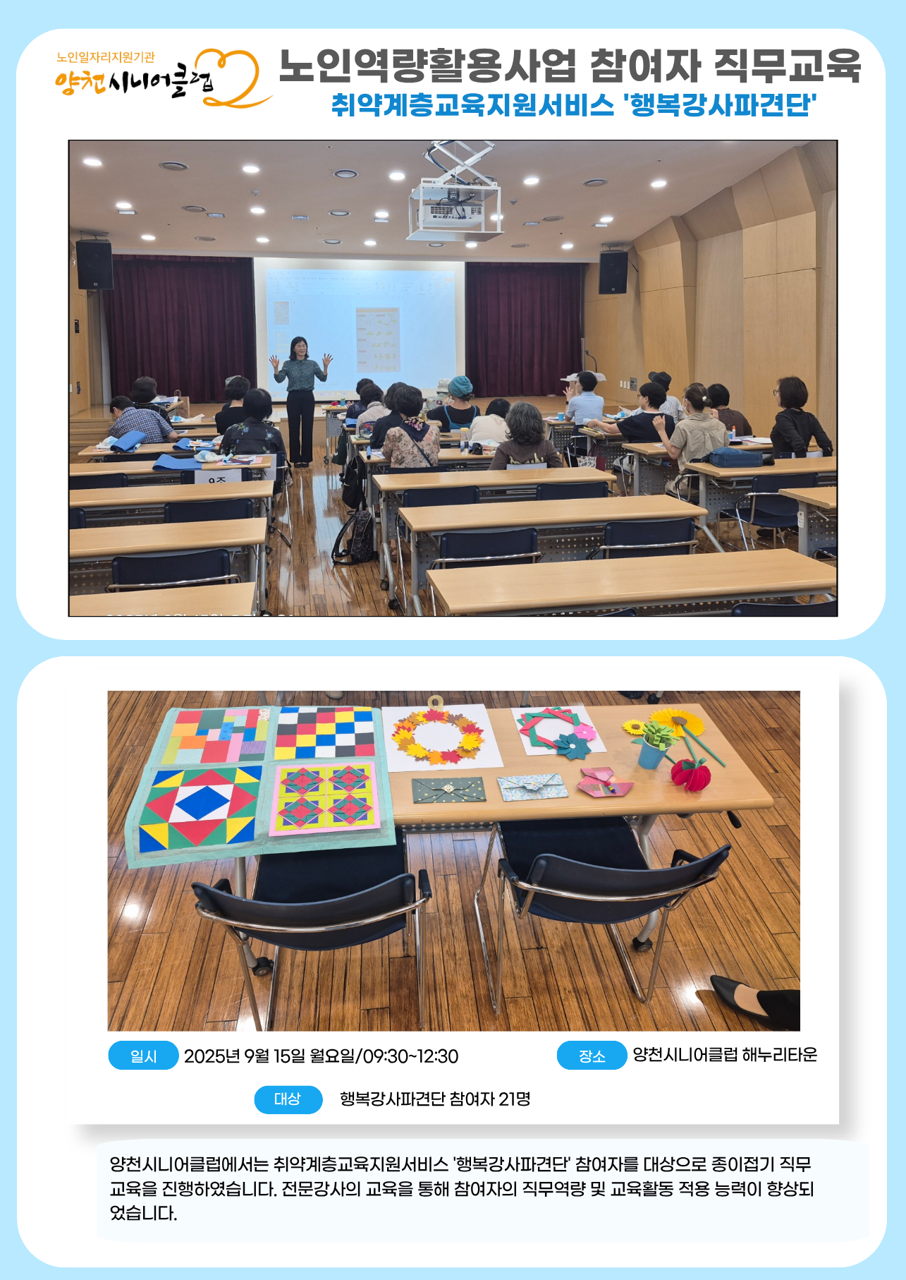 작성자 : 양천시니어클럽(yc_senior@naver.com) 작성일 : 2025-09-15 조회수 : 158