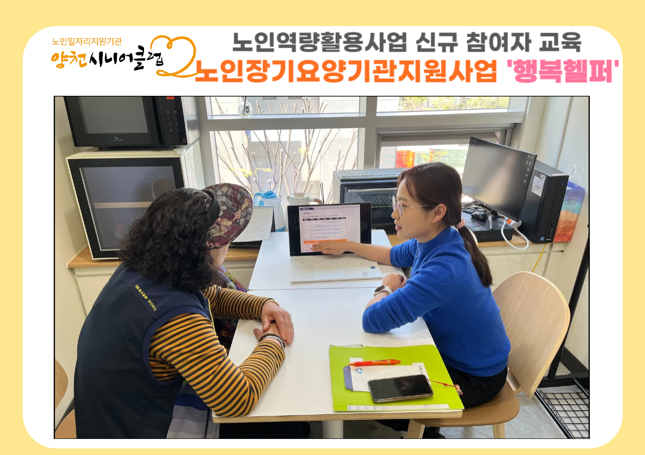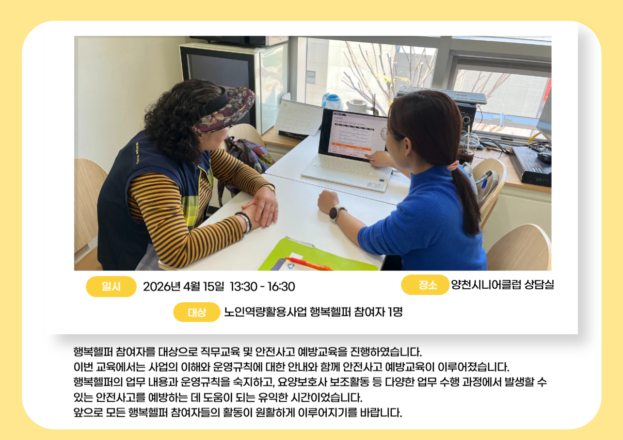 ![]() ![]() 행복헬퍼 참여자를 대상으로 직무교육 및 안전사고 예방교육을 진행하였습니다. 행복헬퍼의 업무 내용과 운영규칙을 숙지하고, 요양보호사 보조활동 등 다양한 업무 수행 과정에서 발생할 수 있는 안전사고를 예방하는 데 도움이 되는 유익한 시간이었습니다. 앞으로 모든 행복헬퍼 참여자들의 활동이 원활하게 이루어지기를 바랍니다. - 일자 : 2026. 04. 15. - 장소 : 양천시니어클럽 3층 상담실 - 참석인원 : '행복헬퍼' 참여자 1명 - 내용 : '행복헬퍼' 신규 참여자 직무 및 안전교육 진행 |